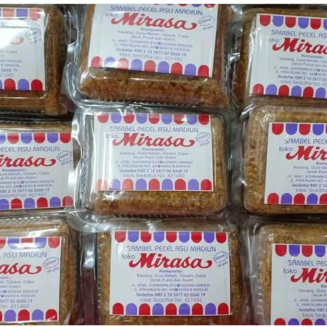 Sambal pecel khas madiun merk Mirasa kemasan isi 250 gram. Sambal bumbu pecel yang satu ini namanya sudah sangat terkenal dan banyak orang tahu toko oleh-oleh mirasa di kota madiun. Sambal pecel dan bumbu pecel madiun yang satu ini dibuat dari bahan berkualitas yang terdiri dari komposisi kacang, gula merah, jeruk purut, garam dan bahan-bahan berkualitas lainnya. Pilihan rasanya ada 2, yaitu sebagai berikut :